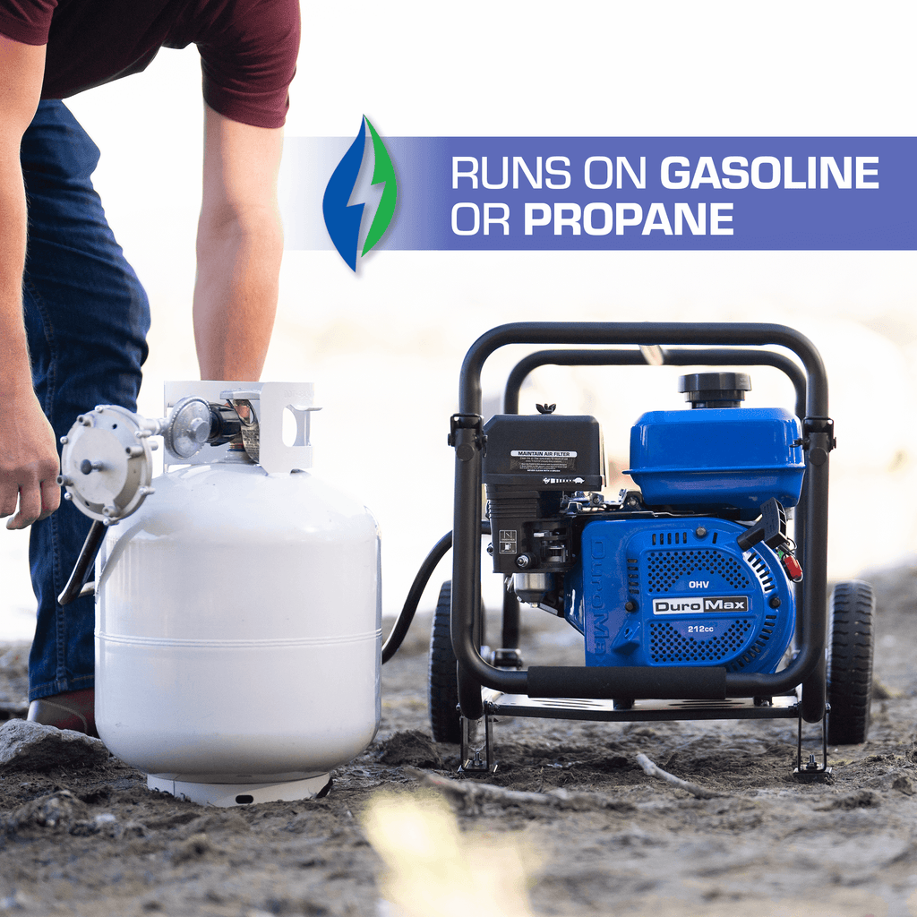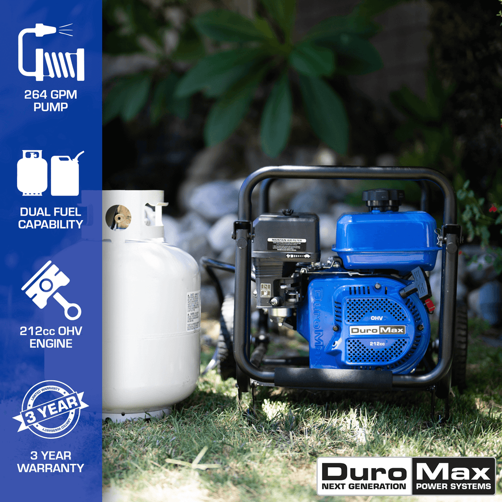 DuroMax Dual Fuel Water Pumps are the ultimate choice when choosing a semi-trash pump for quickly transferring water or de-watering flooded areas. Featuring a powerful DuroMax 212cc engine that can be fueled by either standard gas or liquid propane, this workhorse can power through a tough day’s work thanks to the freedom of fuel choice. The XP652WX can pump 158 gallons of water per minute and tackle solids or debris up to ¼” in diameter, making easy work of jobsites or farm/agricultural applications. The ability to run on propane makes this the professional’s choice, since it offers an extended runtime over the onboard gasoline tank and makes preventative maintenance easier with no gummed-up carburetors or old, stale fuel that occurs commonly with gas on less-frequently used power equipment. This water pump utilizes professional grade components such as a cast iron impeller, volute and heavy-duty seals, and is backed by a manufacturer’s 3-Year Warranty.