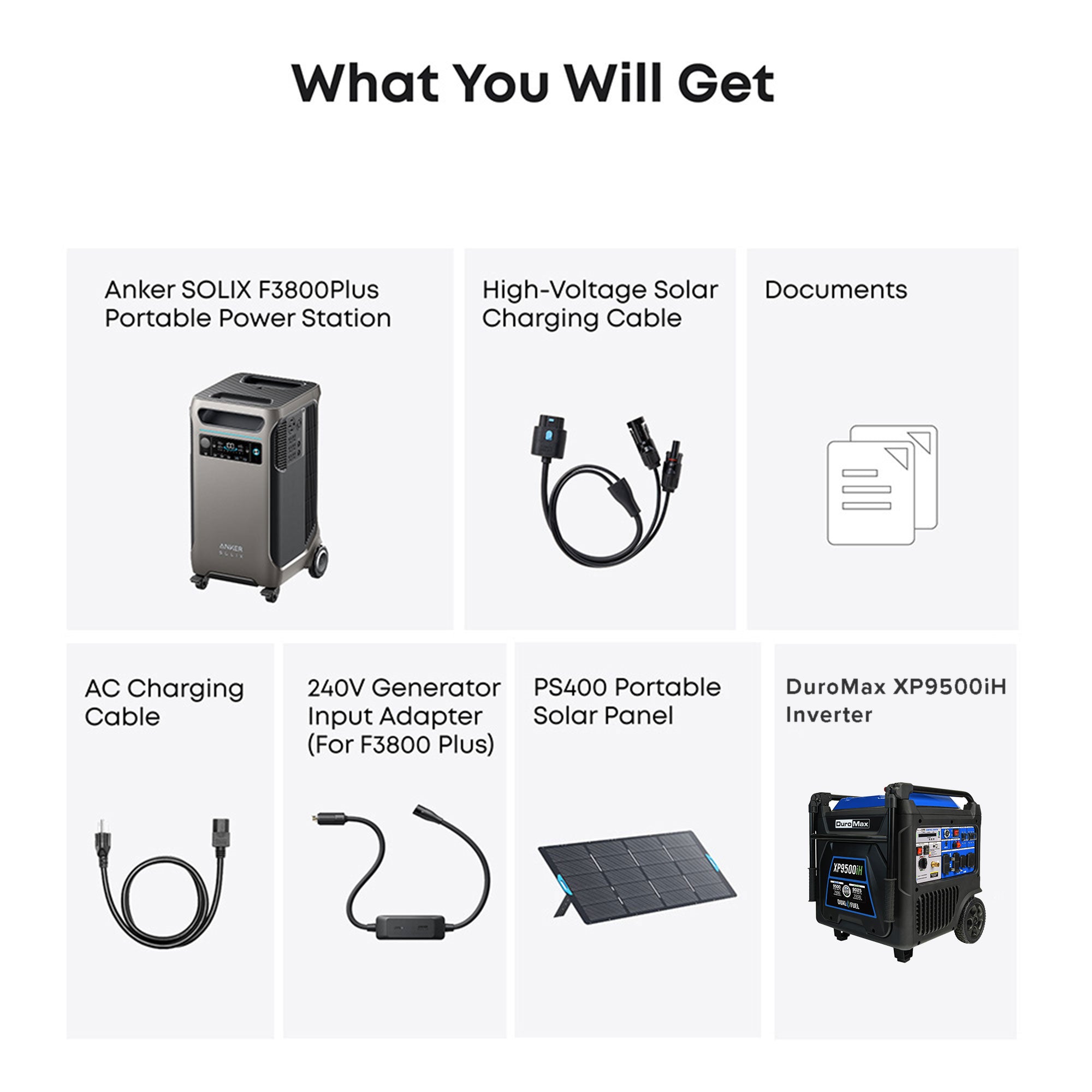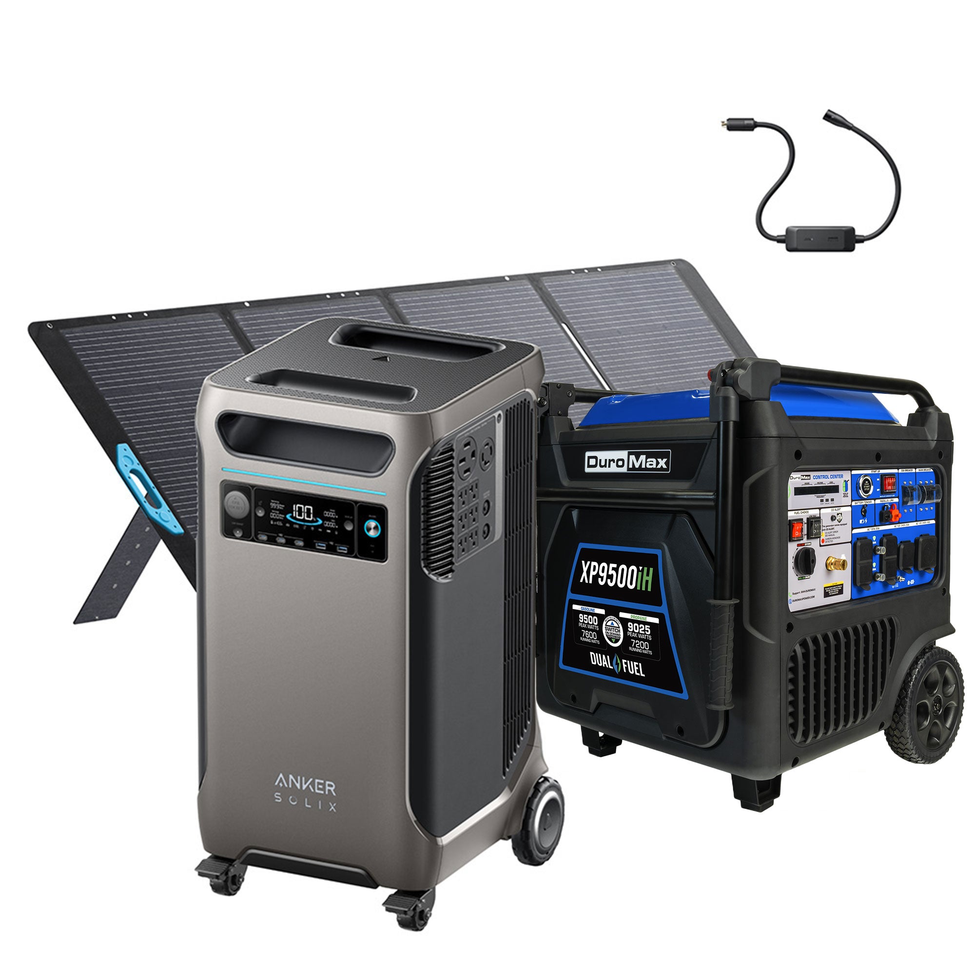 Duromax XP9500iH and Anker SOLIX F3800Plus+PS400+240V Generator Adapter with Transfer Swtich Bundle