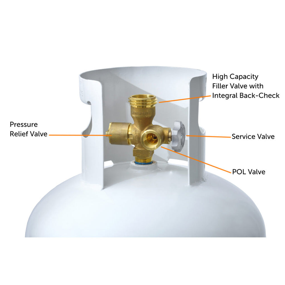 • MULTI-VALVE 100LB TANK: Includes a service valve, high-capacity filler valve with integral back-check, pressure relief valve (375 PSIG) and a POL valve, all in one single unit