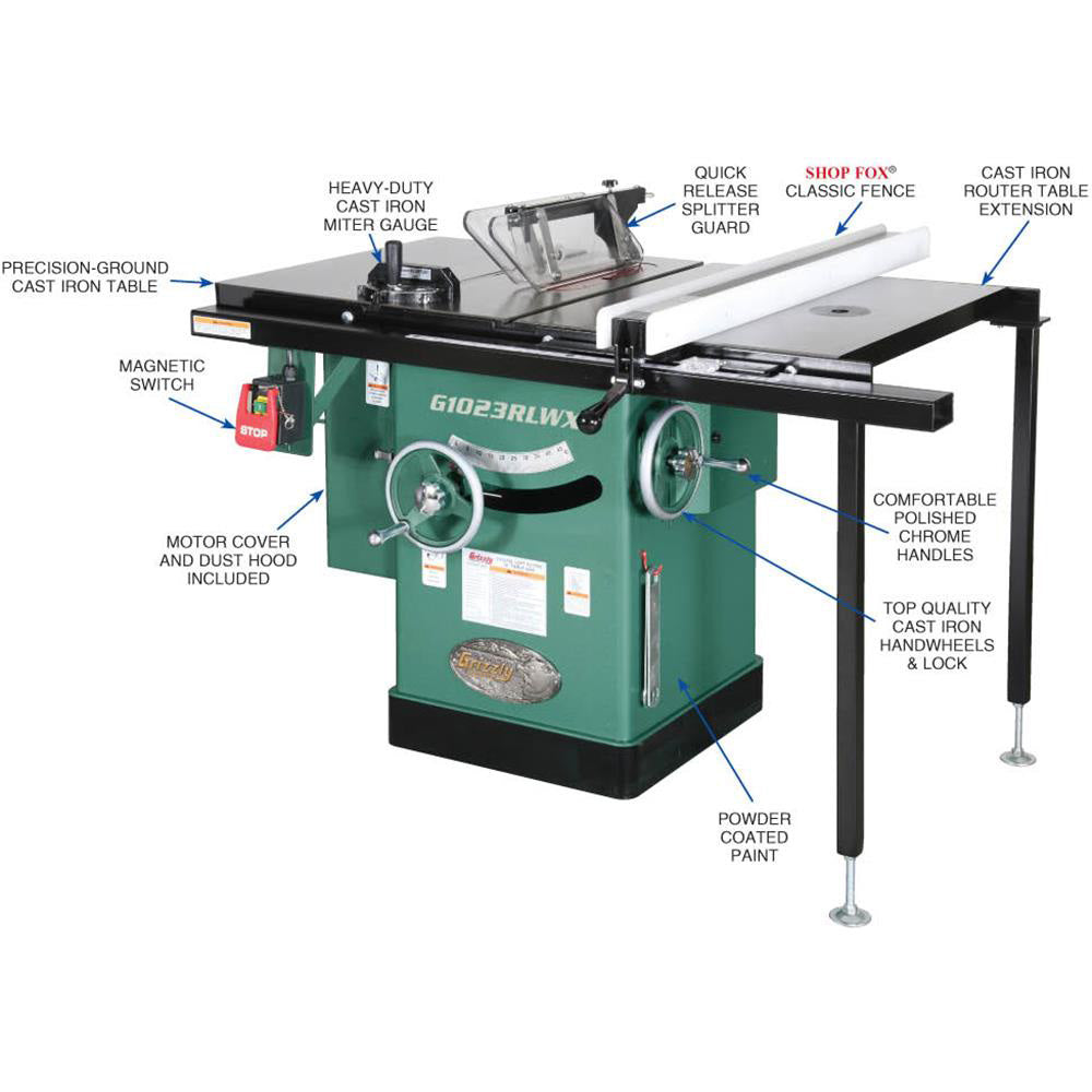 Grizzly G1023RLWX 240V 10 Inch 5 HP 240V Cabinet Left-Tilting Table Saw