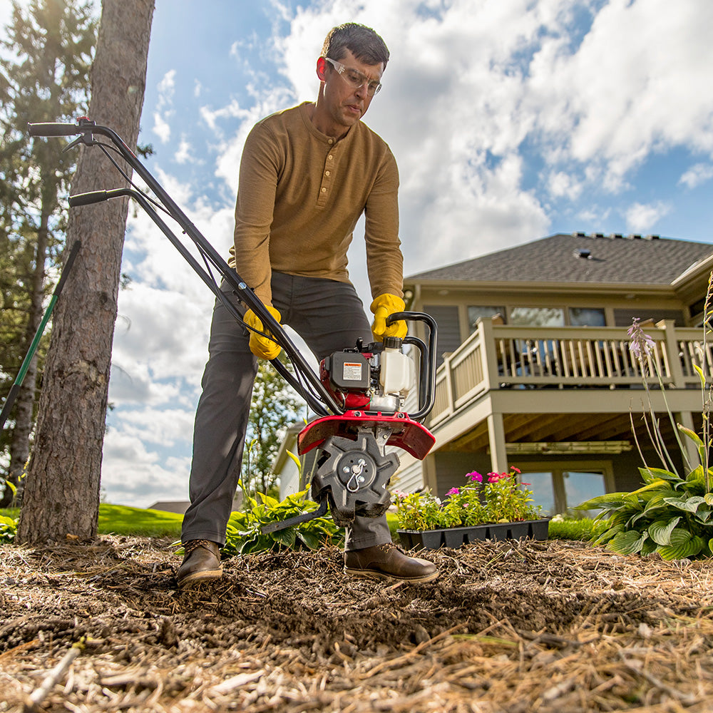 • Use the regular tine configuration and the FG110 will till 9 inches wide. In tight spots, remove the outer tines to till only 6 inches wide. Till within 1 inch of plants without damage.