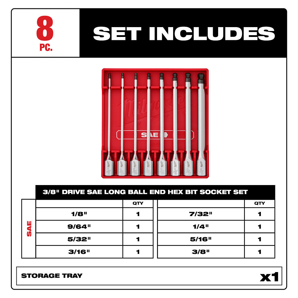 Milwaukee 48-22-9549 3/8" Drive Long Ball End Hex Bit Socket Set - SAE - 8 PC